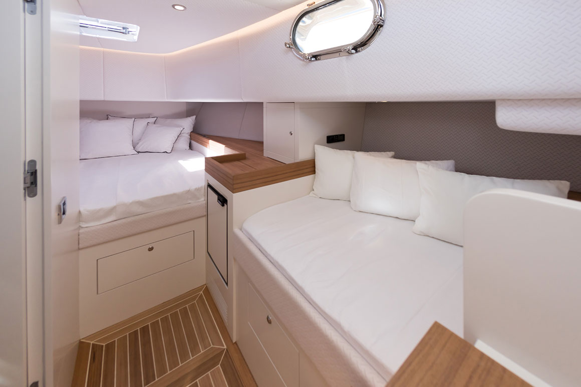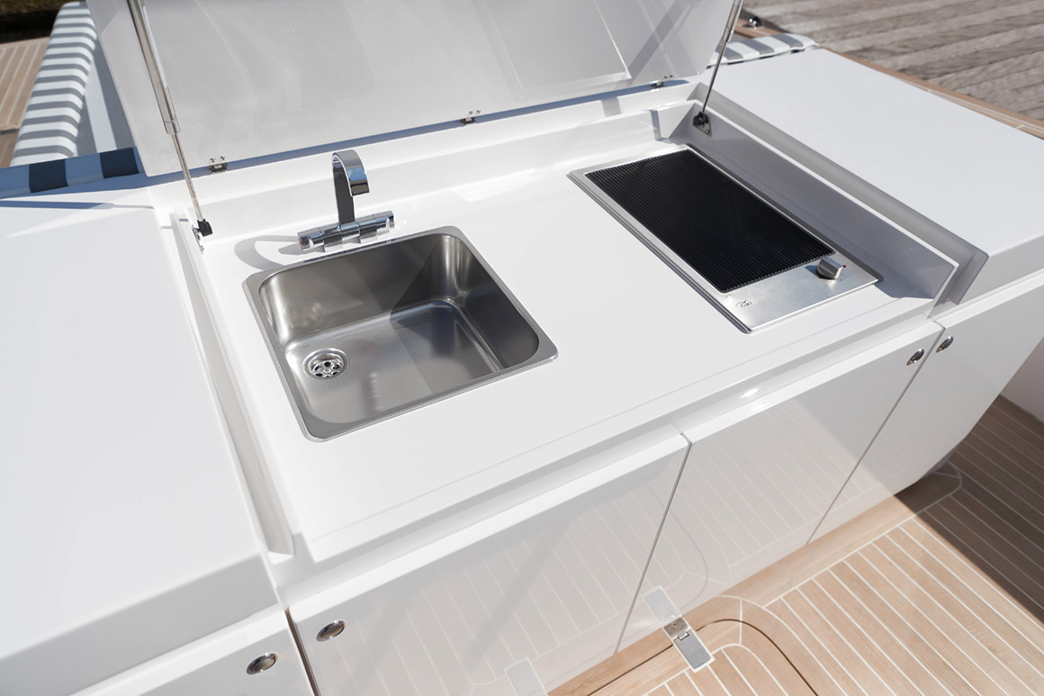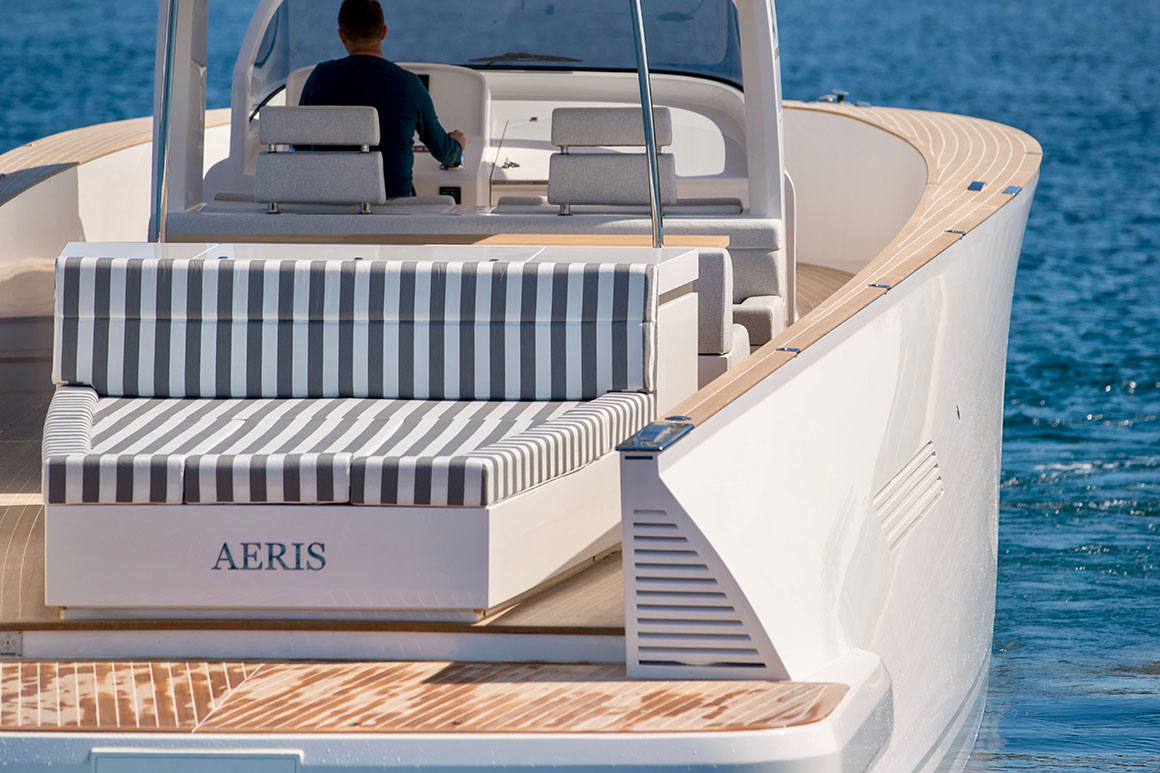 Each Alen 45 can be customised to create the owner’s preferred layout, choice of veneer and upholstery. Below deck, the cabin features a full beam master bed. The stern sun-pad can store 2 Seabobs and launching crane or a built-in fish tank. The exterior wet-bar contains all the necessary equipment to cook a great meal onboard. Bespoke, with timeless style, Alen 45 is the ultimate day boat.
